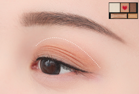 第一步:先选用了一个比较接近肤色的金橘色作为打底色,大面积扫在整个眼窝上,慢慢向上晕染,手法上一定要少量多次去晕染,这样才会更自然哦。